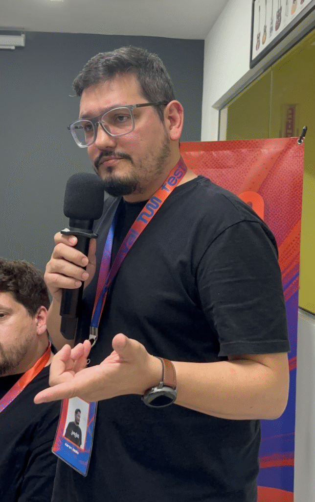 Vitor Soares (ABMI / Gravity Heart) e Vitor Soltau (Vamo Music Hub) apresentaram exemplos práticos de como artistas independentes podem aplicar o storytelling tanto na expressividade de suas obras quanto na forma de comunicar seus projetos, atravessando estética, posicionamento e estratégias de carreira. A troca aprofundou a ideia de que significados compartilhados geram pertencimento e fortalecem a trajetória de longo prazo.